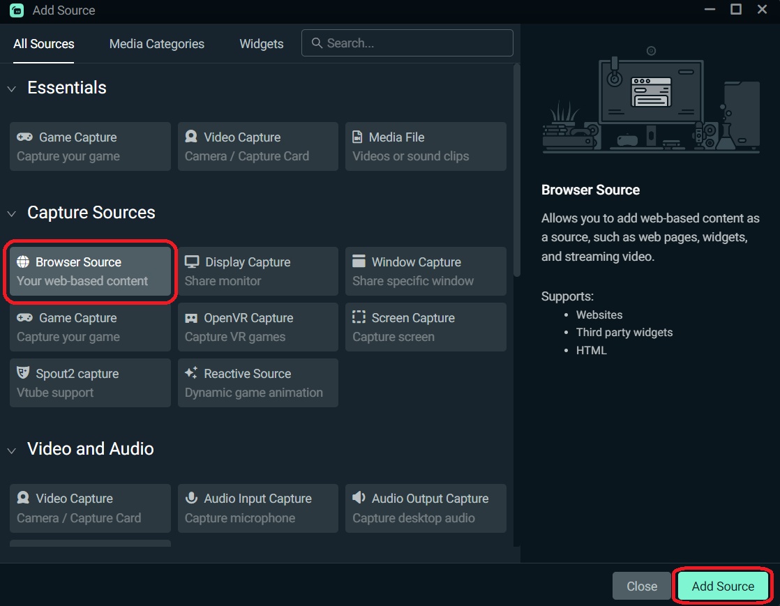 3. A new window opens. Now you click on "Browser Source" and confirm this with a click on "Add Source".