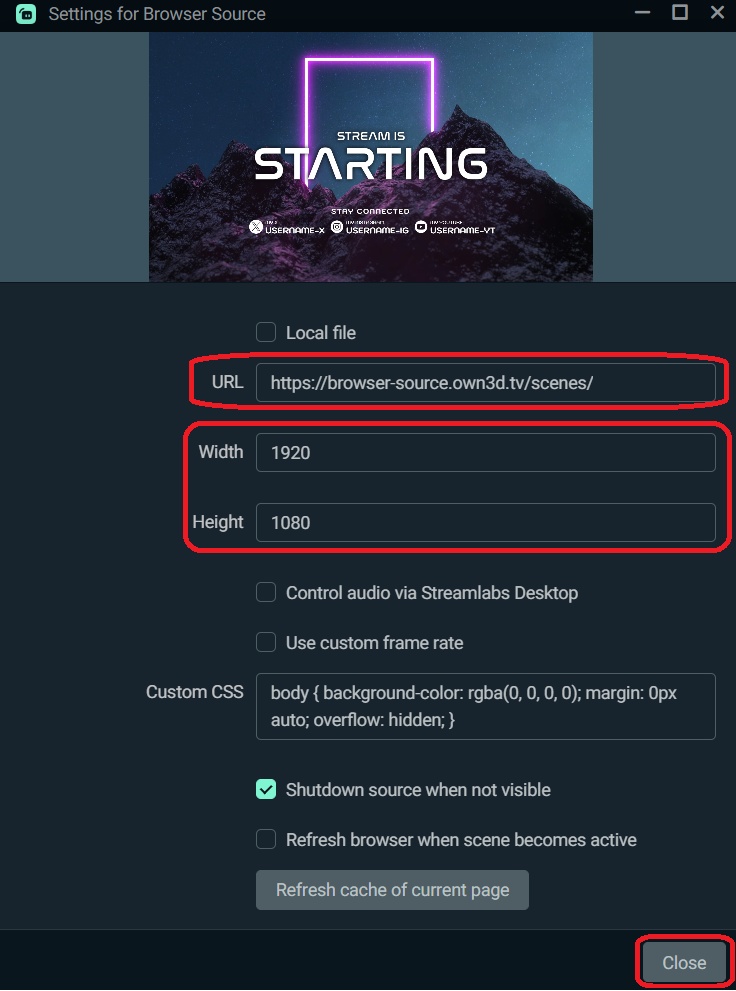 5. Now you have to paste the browser source link you copied before in the "URL" section. Once this is down, you can define your preferred resolution (1920 x 1080 in this case) by adding this to "Width" and "Height" and then you have to click on "Close" once it's done.